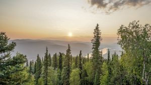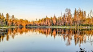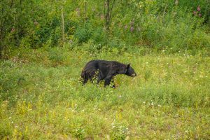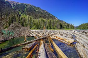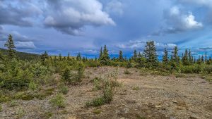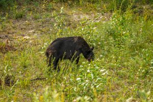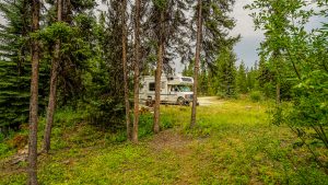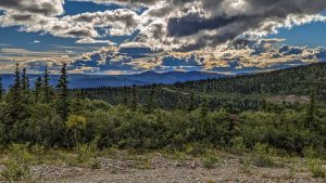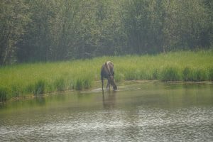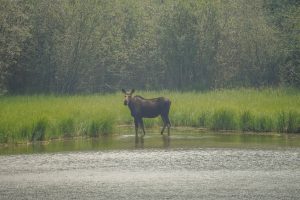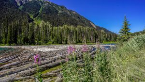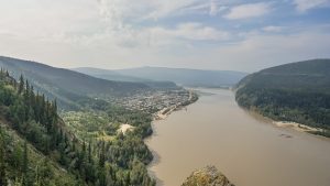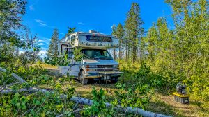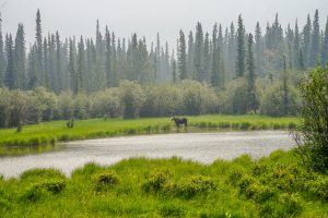 Le temps va brutalement changer et nous allons être suivis pendant plusieurs jours par un ciel particulièrement brumeux et très bas. Même après un passage pluvieux d’une journée, le ciel reste chargé et nous continuons de sentir une odeur de fumée omniprésente. L’explication nous sera donnée par des locaux : il y a de nombreux feux non maîtrisés dans la région de Kamloops notamment et ce sont leurs fumées qui arrivent jusque-là … Quelques jours après, nous apprendrons qu’un feu est en train de ravager le parc de Jasper en Alberta, la ville de Jasper va être partiellement détruite et un pompier va malheureusement perdre la vie, écrasé par la chute d’un arbre … C’est tragique et de plus en plus fréquent. La région d’Edmonton, toujours en Alberta, a été durement touchée quelques mois auparavant. Nous allons, lors de notre route vers l’Alaska, traverser de nombreux paysages calcinés… Les feux font partis de la vie de la forêt : ils sont indispensables à leur développement. Donc, certains sont volontairement laissés « libres », les pompiers n’intervenant que s’ils se rapprochent trop des zones construites ou protégées. Néanmoins, cela attriste toujours de traverser ces zones dévastées, même si nous nous apercevons que la nature reprend vite ses droits avec la pousse de nouveaux plants. C’est sans aucun doute plus difficile de s’en remettre pour les animaux qui perdent leur habitat et leur garde-manger et pour les hommes …