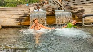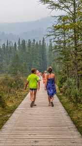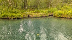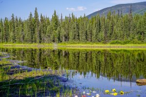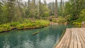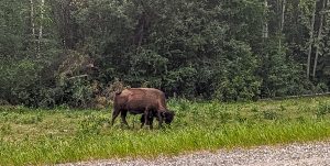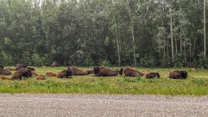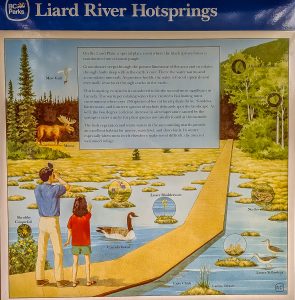 En cours de route, nous décidons de faire une pause détente aux Liard River Hotsprings. Ce sont des sources d’eau chaude (voire brûlantes) en plein nature. L’environnement est absolument splendide, il est possible de nager un peu dans les bassins et de passer d’une eau brûlante (plus de 40°C) à une eau tout juste tiède … Nous allons adorer ! Pour ne rien gâcher, l’accès est étonnamment pas cher, ce qui est assez rare pour être souligné ! Nous repartons de là détendus et des étoiles pleins les yeux …D’autant que sur la route, nous aurons la chance de croiser un orignal, un ours et des troupeaux de bisons … Tout cela le même jour !!