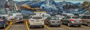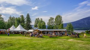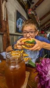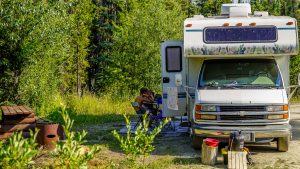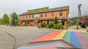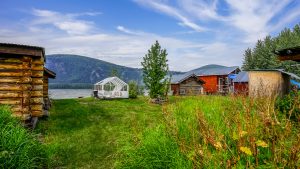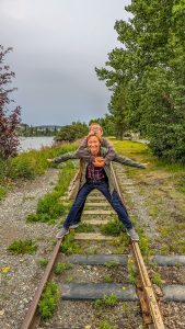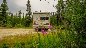 Commence maintenant un périple un peu différent : nous prenons la route vers le Yukon, état canadien limitrophe avec l’Alaska. Nous nous engageons, nous le savons, sur de longs tronçons de route, où les villes (et stations essence !) vont se faire beaucoup plus rares … Tout comme la connection réseau dont a besoin Caroline pour son travail : il faut donc calculer les trajets pour s’assurer d’avoir un spot le soir permettant à Caroline de travailler le lendemain matin. L’autre contrainte est qu’il n’est pas possible de travailler en roulant donc les journées s’organisent de telle sorte que le matin, l’ambiance est studieuse sur le spot trouvé la veille et l’après-midi, nous roulons ! La route au départ de Vancouver est splendide, bordée de forêts et de lacs aux couleurs magiques … Nous apprécions aussi les hauts massifs, parfois encore enneigés. La curiosité nous fera nous arrêter devant le bar qui sert de lieu de tournage dans la série Netflix Virgin River… Pas de Jack ni de Preach (au grand désespoir de Caroline) mais une vue superbe !