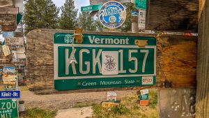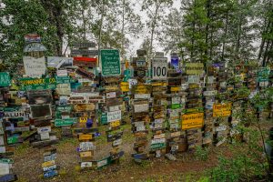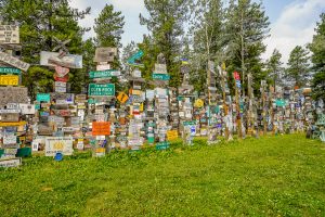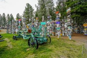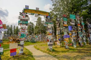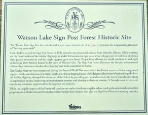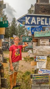 La ville de Watson lake est connue pour sa « forêt ». Ne vous y trompez pas, il s’agit ici d’une forêt de panneaux indicateurs, initiée par les constructeurs de l’Alaska Highway qui avaient pris l’habitude d’y accrocher une plaque mentionnant l’endroit d’où ils étaient originaires. Les voyageurs passant par là ont ensuite repris la tradition et ce sont donc aujourd’hui plus de 76000 panneaux (plaques d’immatriculation, plaques en bois, tissus, supports plastifiés) qui ornent cette forêt d’un autre genre. Et bien sûr Pepito ne va pas faillir à la règle : nous y accrocherons son ancienne plaque d’immatriculation agrémentée d’un sticker de la Cordée … Watson Lake sign forest: check !!