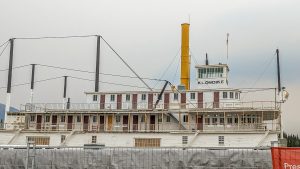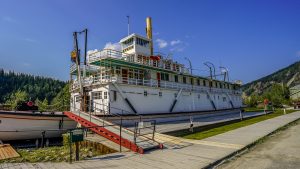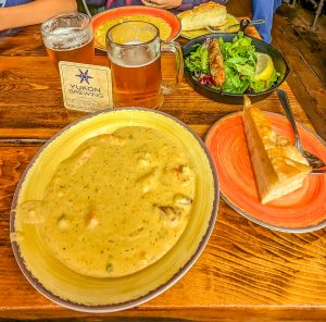 Nous allons faire la route vers Whitehorse à 5, avec 2 jeunes autostoppers pris en charge à Watson Lake. Ils dorment en tente et voyagent en stop et/ou transport public depuis le Mexique …. Respect … Nous verrons 3 ours à nouveau sur le chemin … On ne s’en lasse pas ! Nous allons prendre un peu plus de temps à Whitehorse car c’est une ville chargée d’histoire que nous prenons plaisir à découvrir. Elle a conservé un magnifique bateau à roues, actuellement en restauration, qui rappelle la période faste de la ruée vers l’or et la foi incroyable de ces gens qui ont tout quitté pour entreprendre un voyage périlleux en quête d’une vie meilleure, au coeur d’une région si rude … Nous avons la chance d’être en plein été donc les journées sont très longues (nous n’avons que quelques heures de nuit seulement), mais l’hiver est accompagné de nuits interminables et d’un isolement lié au gel des cours d’eau qui est, même encore aujourd’hui, très difficile à vivre. Alors imaginez à l’époque … lorsque les sirènes des bateaux ne se faisaient plus entendre pendant de très longs mois … Whitehorse sera aussi pour nous synonyme d’étape gastronomique .. Le temps est humide et se rafraichit donc nous décidons de nous offrir un petit restaurant et ce sera une superbe découverte : cadre typique, patronne super souriante et chowlder (vous savez la soupe aux fruits de mer et/ou poisson très crémeuse que nous avons découvert à Monterey, dégustée à San Francisco et revisitée à Victoria) d’entologie !