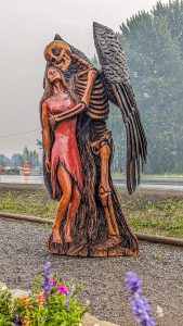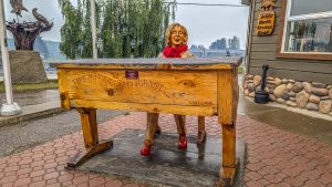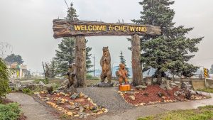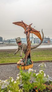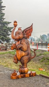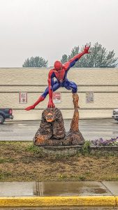 Nous découvrons sous la pluie le village de Chetwynd qui organise, tous les ans, un concours international de sculptures sur bois. Nous avons raté la date de peu mais nous ne pouvons qu’être admiratifs du travail de précision qui est réalisé par ces artistes … Les sculptures sont exposées dans toute la ville, il y en a pour tous les goûts, et cela donne un charme tout particulier à cette bourgade.