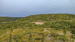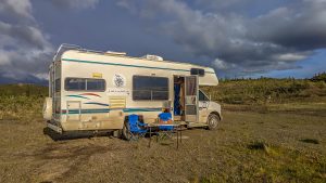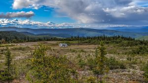 Nous quittons Dawson city par le biais d’un ferry qui nous amène sur l’autre berge. Pour la petite histoire, en hiver, c’est un pont gelé qui relie les 2 côtés. Nous trouvons encore une fois un bivouac seuls au monde avant de passer la frontière demain et d’entrer officiellement en Alaska …