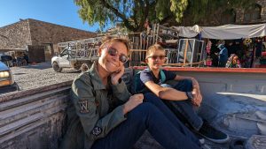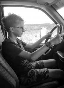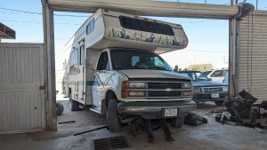 Afin d’économiser un peu Pepito qui a déjà roulé plus de 5000 kilomètres en quelques semaines, nous décidons d’emprunter une route un peu plus courte que celle celle proposée par Google Maps pour rejoindre le petit poste de frontière que nous avons repéré. Mauvaise idée …. Nous allons lui faire faire près de 400 kilomètres sur 2 jours, uniquement sur des pistes caillouteuses de tôle ondulée .. le paysage est fantastique mais le voyage interminable … Nous ne croisons personne ou presque sur ces routes désertiques ce qui va permettre à Jules de prendre sa première leçon de conduite. Mais la question de l’approvisionnement en essence est sensible, surtout pour un glouton comme Pepito. Et ce n’est absolument pas un véhicule adapté pour ce type de route : les placards s’ouvrent en permanence, la gazinière fait des bonds, les aliments se renversent dans le frigo … A la fin de la première journée, la boîte de vitesse fait des siennes : impossible de rouler en position Drive qui fait un bruit métallique anormal. Heureusement les autres positions fonctionnent. Et nous nous apercevons que le ballon d’eau chaude fuit … Après une nuit sur un parking de station-service, unique point d’activité d’une petite ville devenue fantôme suite à la fermeture de la dernière mine de fer, nous reprenons la route, peu fiers, d’autant que le pot d’échappement fait aussi un bruit bizarre … Arrivés à Ojinaga, ville frontière avec les US, nous trouvons une pépite : le garage Alex, tenu par un garagiste hors-pair : en quelques secondes, il identifie le problème de la boîte de vitesse, qu’il va mettre 30 minutes tout au plus à solutionner : beaucoup moins grave que prévu, il s’agissant juste de changer le sélectionneur de la boite de vitesse qu’il a en stock en plus ! Nous sommes tellement soulagés que nous décidons de lui confier Pepito le lendemain pour une visite de contrôle complète avec vidanges, changements de filtres, de roulements et même petite soudure au niveau du pot d’échappement qu’il a fallu préalablement vider des quelques cailloux qu’il avait stocké en chemin.