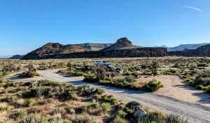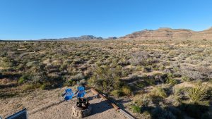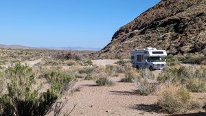 Tout d’abord nous nous posons pour la nuit sur un spot en plein milieu du Désert de Mojave. Nous sommes encore agréablement surpris par les infrastructures mises en place pour les personnes qui voyagent et/ou vivent à temps plein dans une maison roulante …. Le site dispose d’emplacements délimités, tous équipés d’une table de pique-nique, d’un foyer pour y faire un feu. Des toilettes (quasi toujours impeccables) et poubelles sont à disposition … Et pour bénéficier de tout cela, il nous faut juste mettre 6 USD dans une enveloppe, déposée dans une boîte à l’entrée … Personne ne viendra vérifier quoi que ce soit, les quelques autres campeurs présents sont respectueux : pas de déchets partout, pas de bruit … Nous sommes tous là pour la même chose : profiter et s’imprégner de la nature environnante. Et cela rend les choses tellement plus simples … !