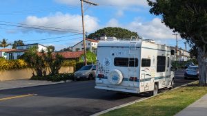 Nous arrivons sur la côte Pacifique par le biais d’une ville balnéaire du nom de Dana Point. Nous sommes samedi soir, les gens profitent de la fin d’une belle journée dans leur week-end pour se poser sur la plage. Encore une fois, tout est bien organisé : des tables de pique-nique à disposition tout le long de la promenade, des barbecues partout … tout est fait pour accueillir les réunions de famille, anniversaires, fêtes entre copains… Nous sommes contents de retrouver la mer. L’endroit est très résidentiel, pas facile pour passer inaperçus avec Pepito mais nous trouvons une rue calme qui, à priori, nous permet de rester stationner toute la nuit. Et nous n’aurons effectivement aucun souci.
